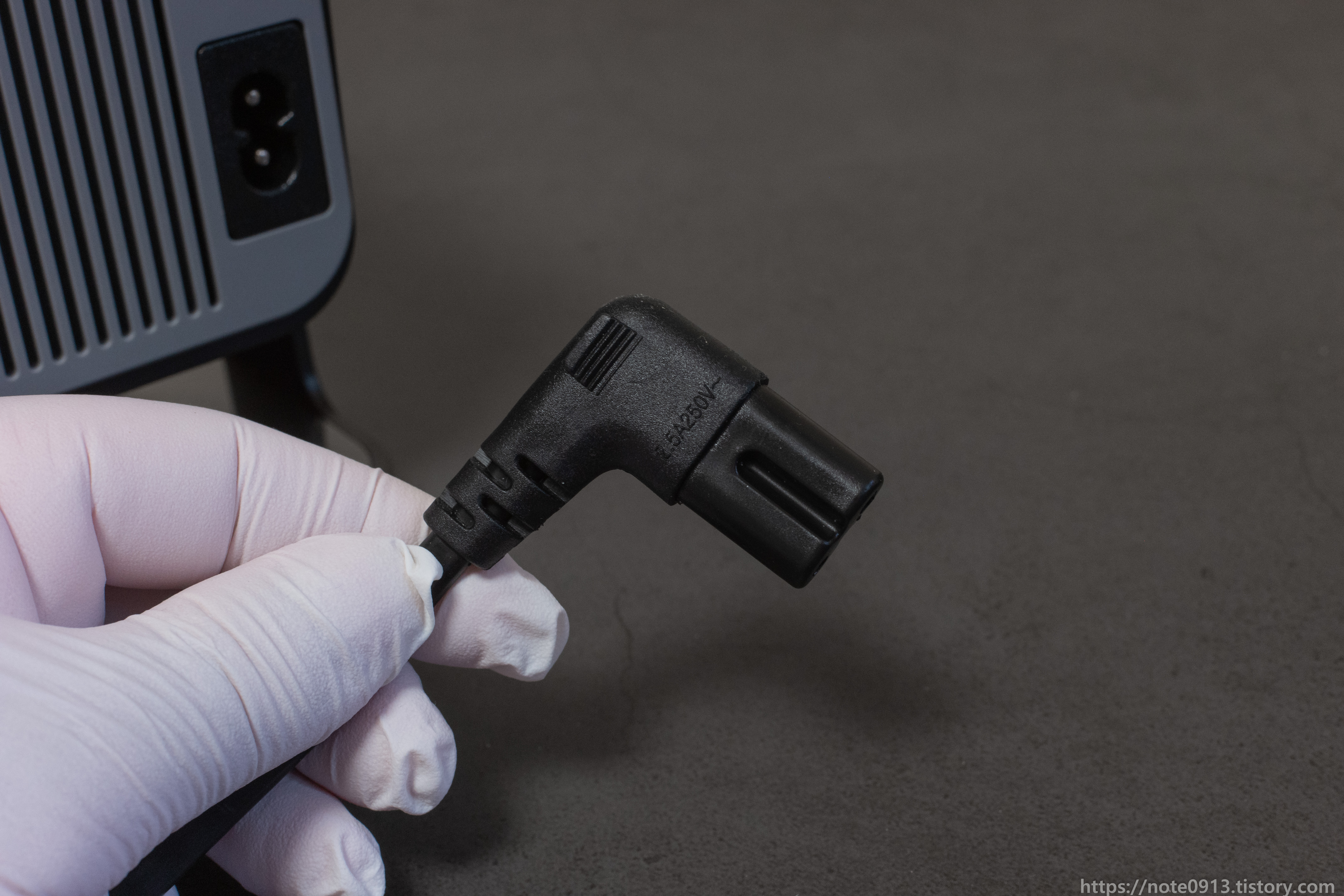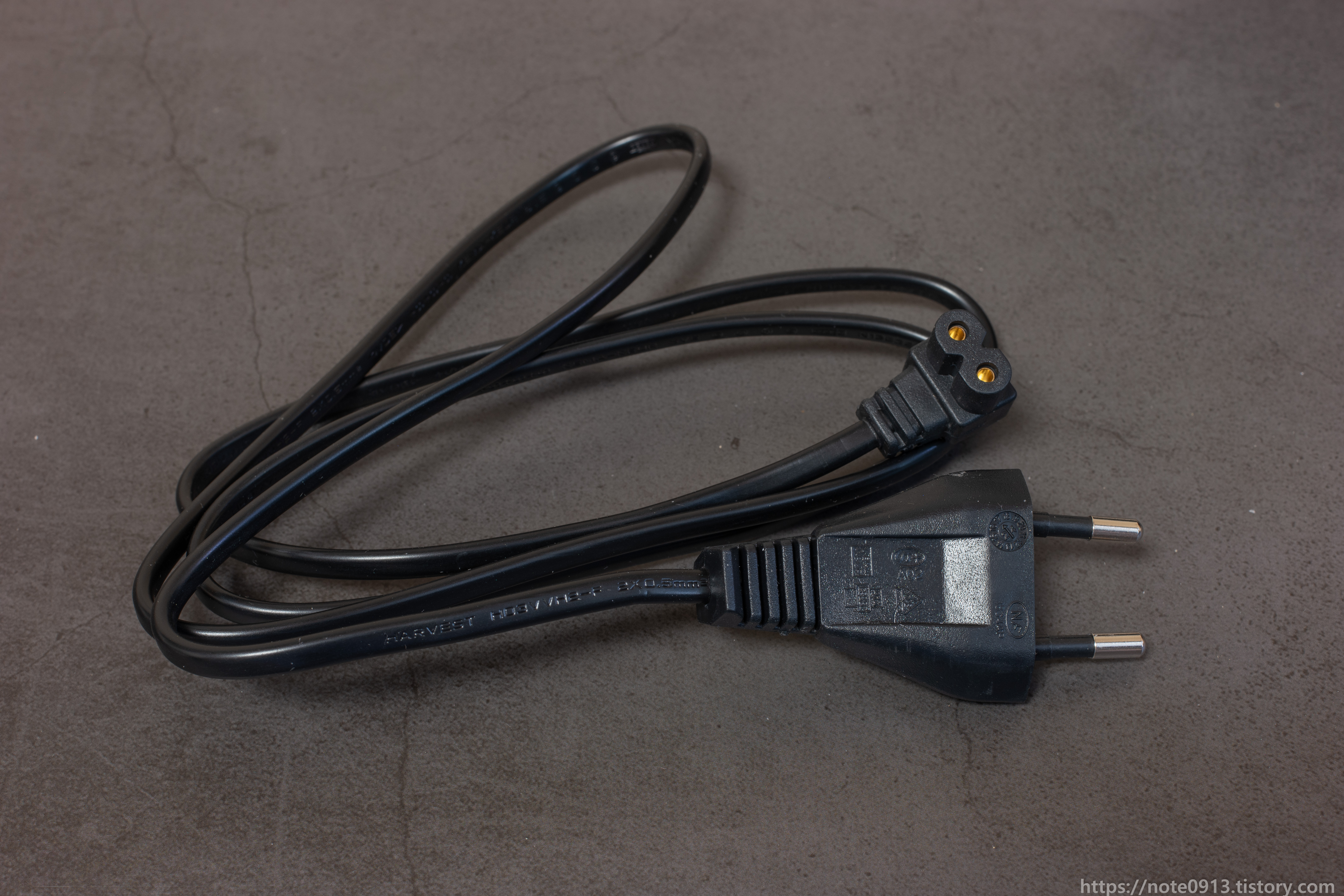 HY320 전원 케이블입니다. 90도로 꺾여있습니다. 플러그는 EU규격이라 한국 콘센트에는 들어가기는 하지만 굵기가 얇아서 쉽게 빠집니다.