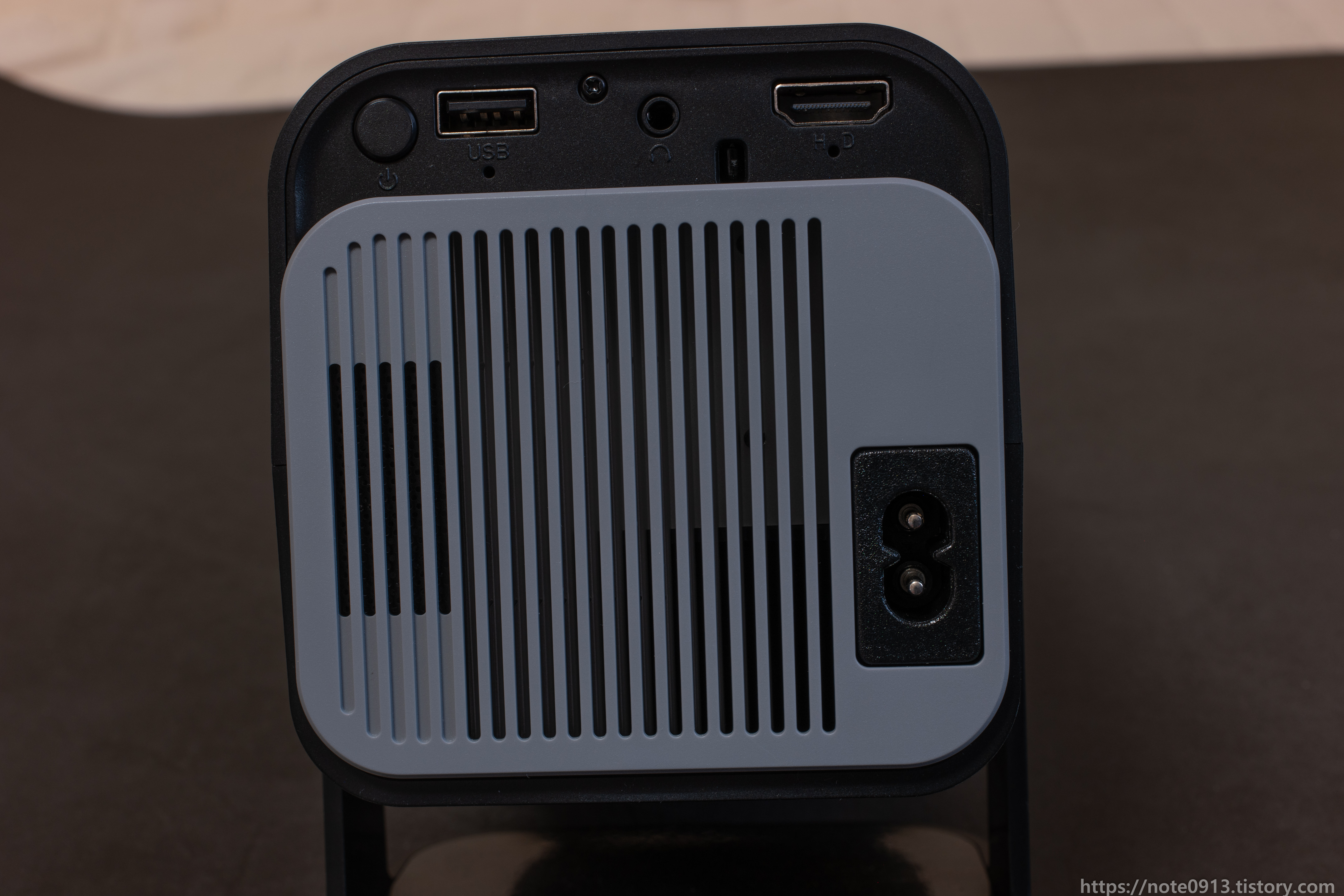 HY320 후면부입니다. 아래쪽 회색 커버부분에는 스피커, 열 배출구, 8자 전원 코드를 꽂을 수 있는 소켓이 있습니다.