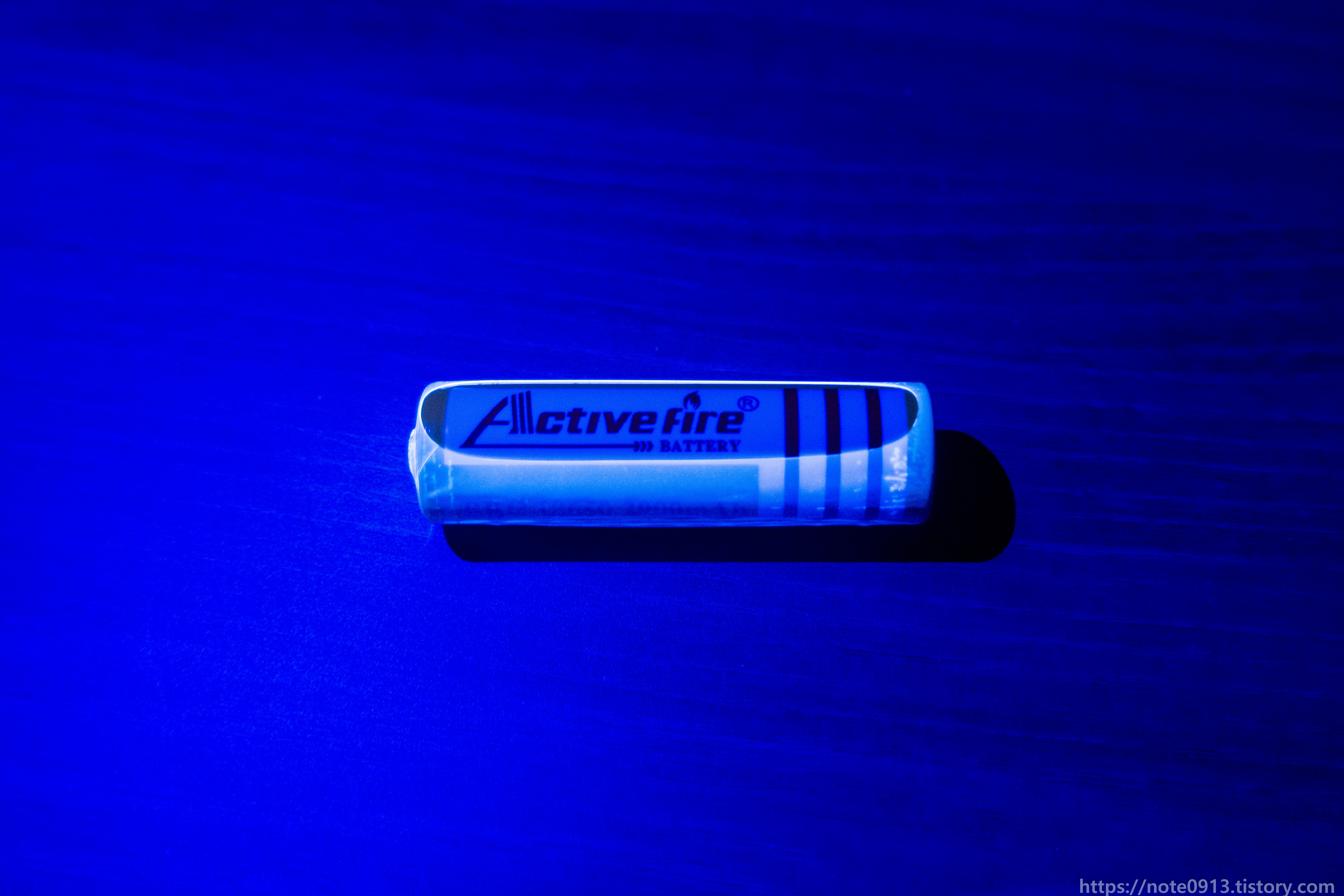일단 간단하게 UV 라이트를 쏴봤는데 18650을 감싸고 있는 비닐에다가 쏘면 빛이 납니다.