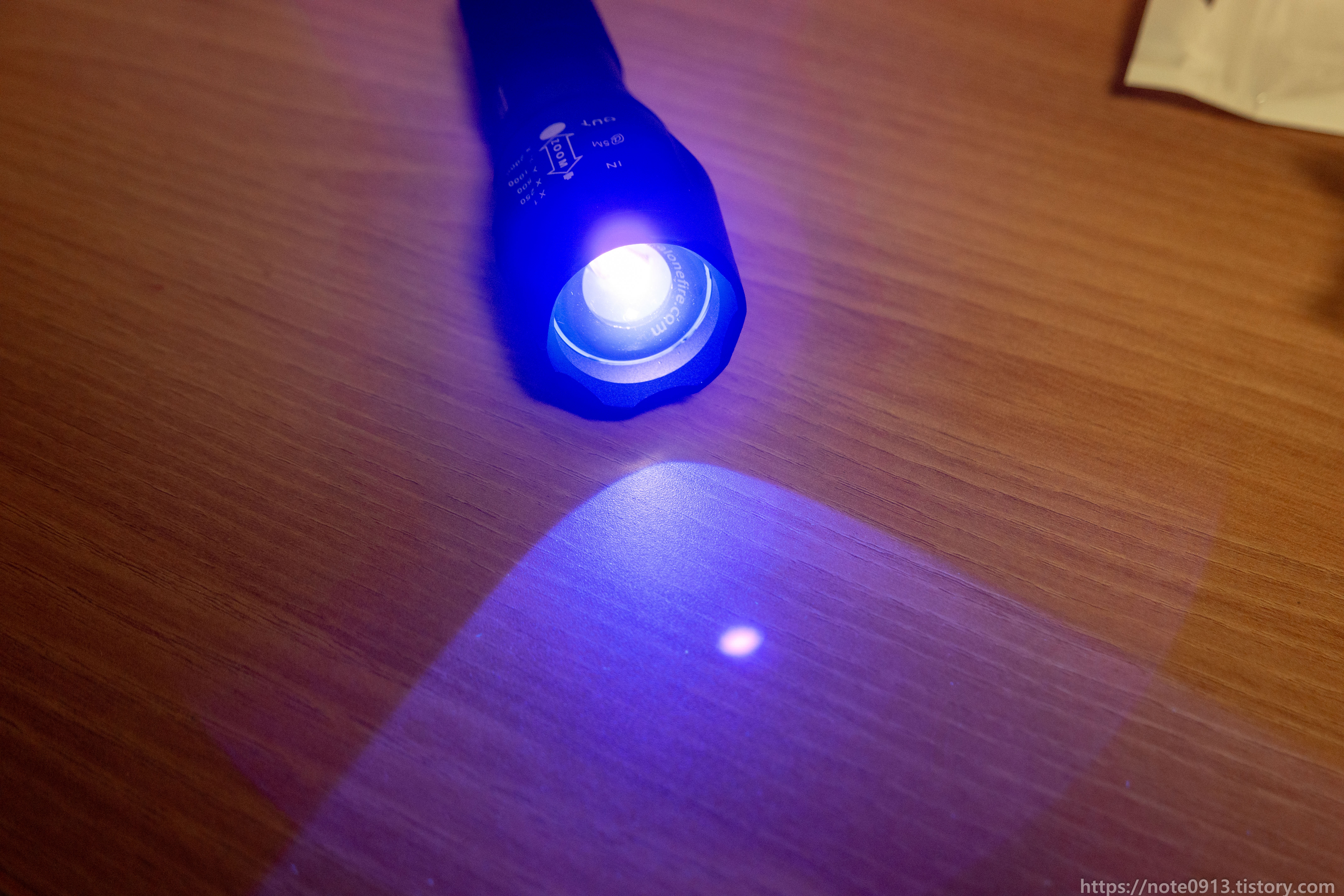 이거 살 때는 395nm, 365nm 빛이 동시에 발광하는 줄 알았는데 하나씩 빛이 나네요. 오히려 좋습니다. 위 사진은 395nm LED 가 켜졌을 때 모습입니다. 보기에는 보라색 불 빛이 나옵니다.