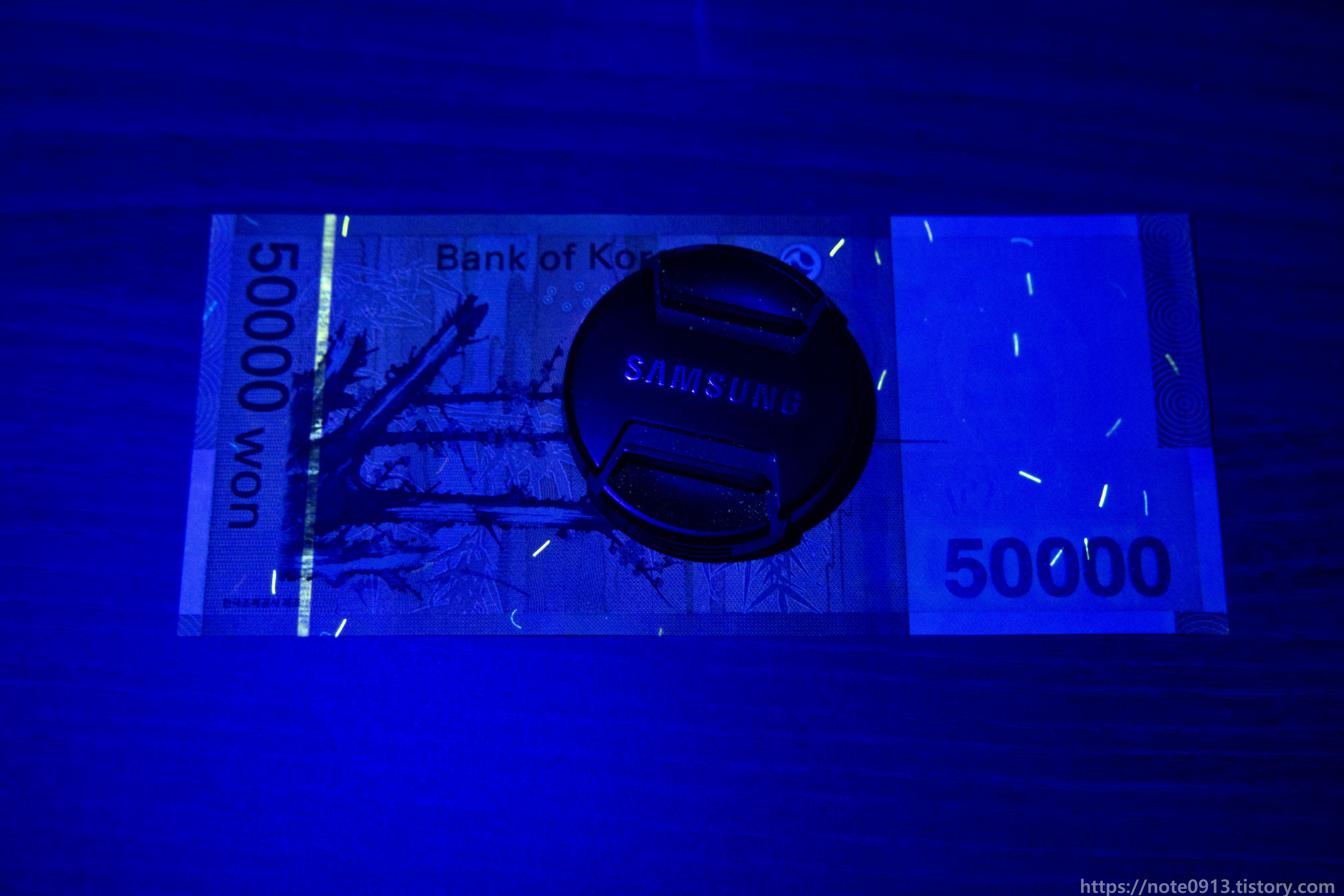 만원권으로도 테스트 해보았습니다. 오만원과 마찬가지로 365nm로 쏘면 가운데가 빛이 납니다.