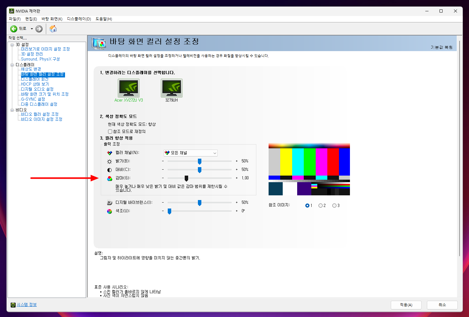 바탕 화면 컬러 설정 조정에 보면 3.컬러 향샹 적용 밑에 출력 조정에 감마(G)를 조절할 수 있는 슬라이더가 있습니다.