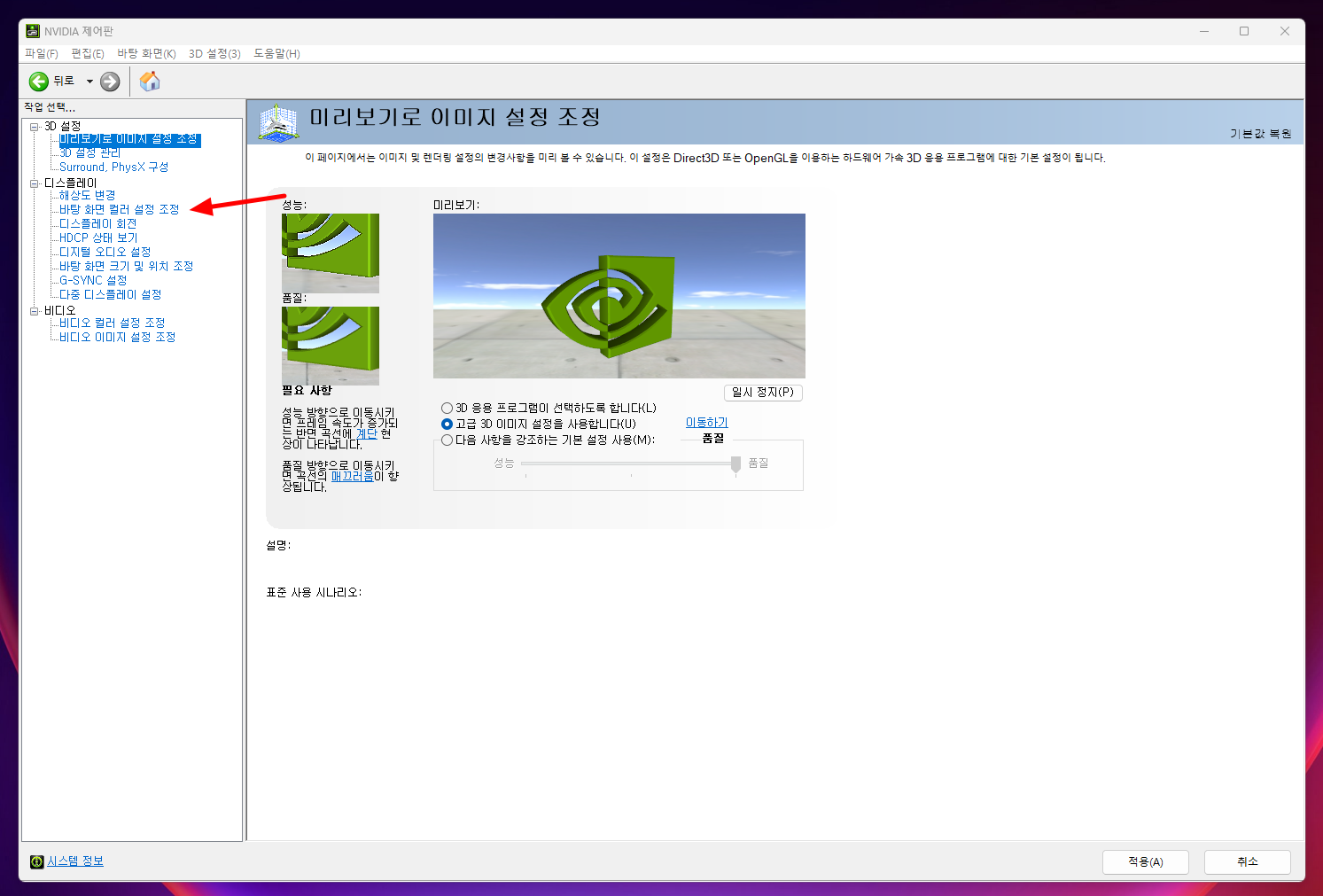 엔비디아 제어판 화면이 나타나면 왼쪽에 "바탕화면 컬러 조정" 메뉴를 클릭합니다.
