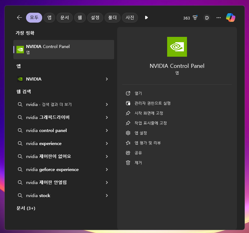 또다른 방법은 시작메뉴에서 NVIDIA Control Panel 을 검색하여 실행하면 됩니다.