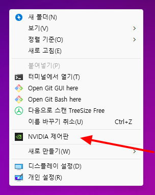 NVIDIA 제어판에 들어가는 방법은 바탕화면에 마우스 우클릭 후 나오는 컨텍스트 메뉴에서 NVIDIA 제어판을 클릭하면 됩니다.