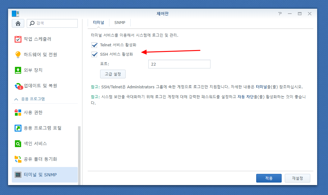 시놀로지 나스 SSH 활성화하기