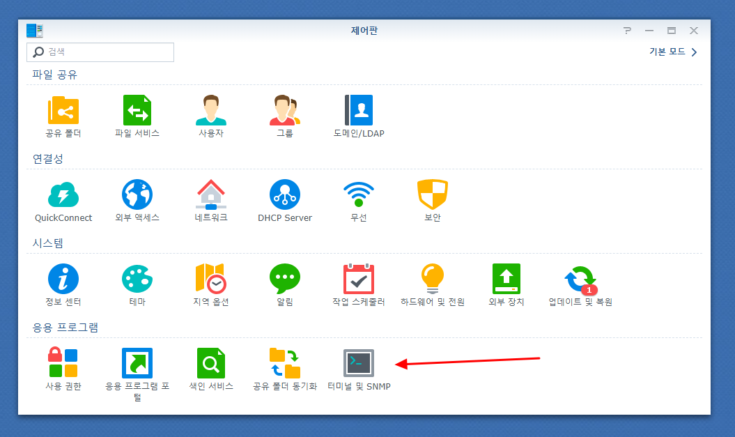 늘 하던대로, 인터넷 브라우저로 시놀로지 나스 DSM 페이지로 접속해 제어판을 열어줍니다. 여기서 터미널 및 SNMP 항목을 클릭해줍니다.