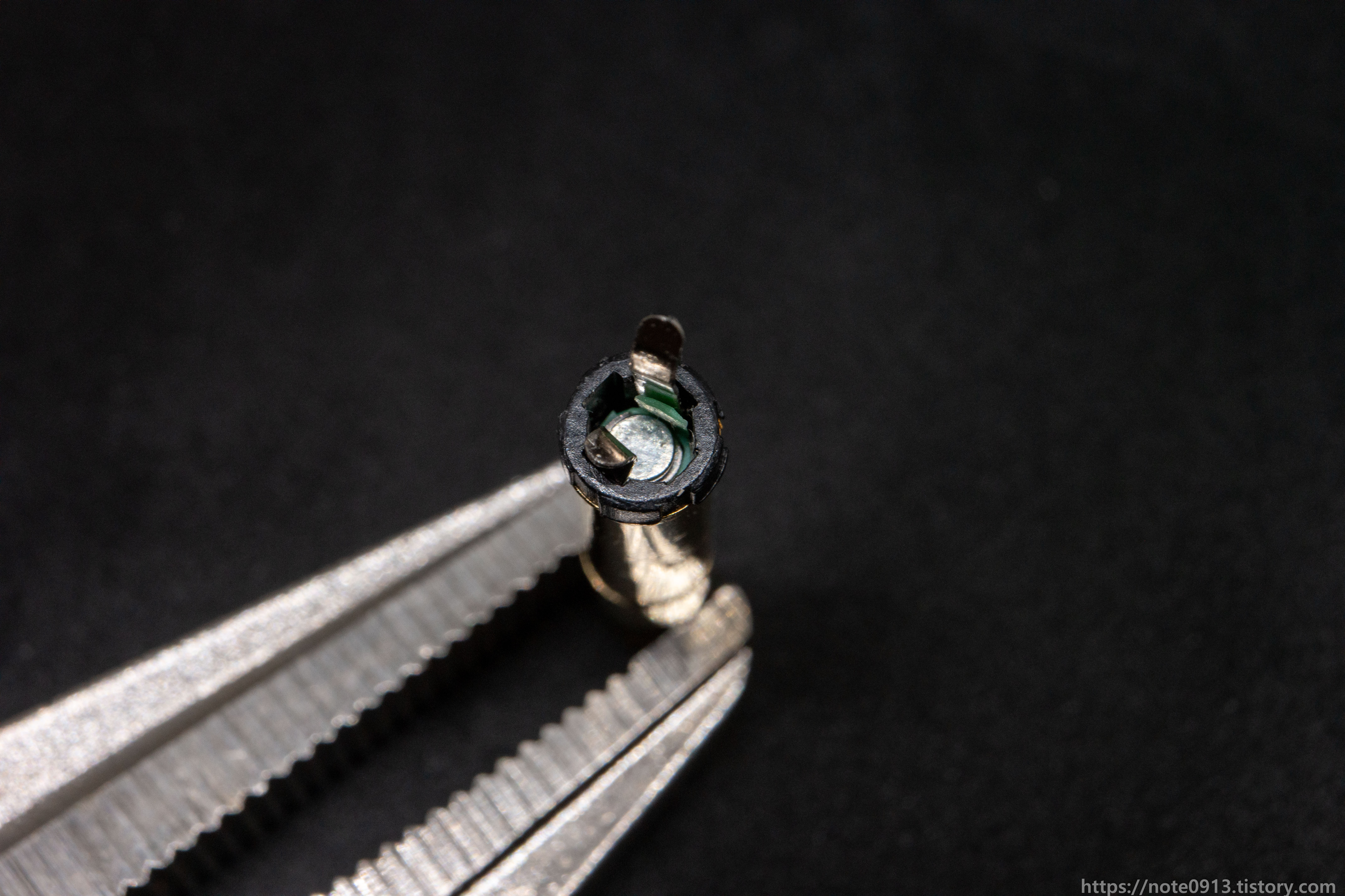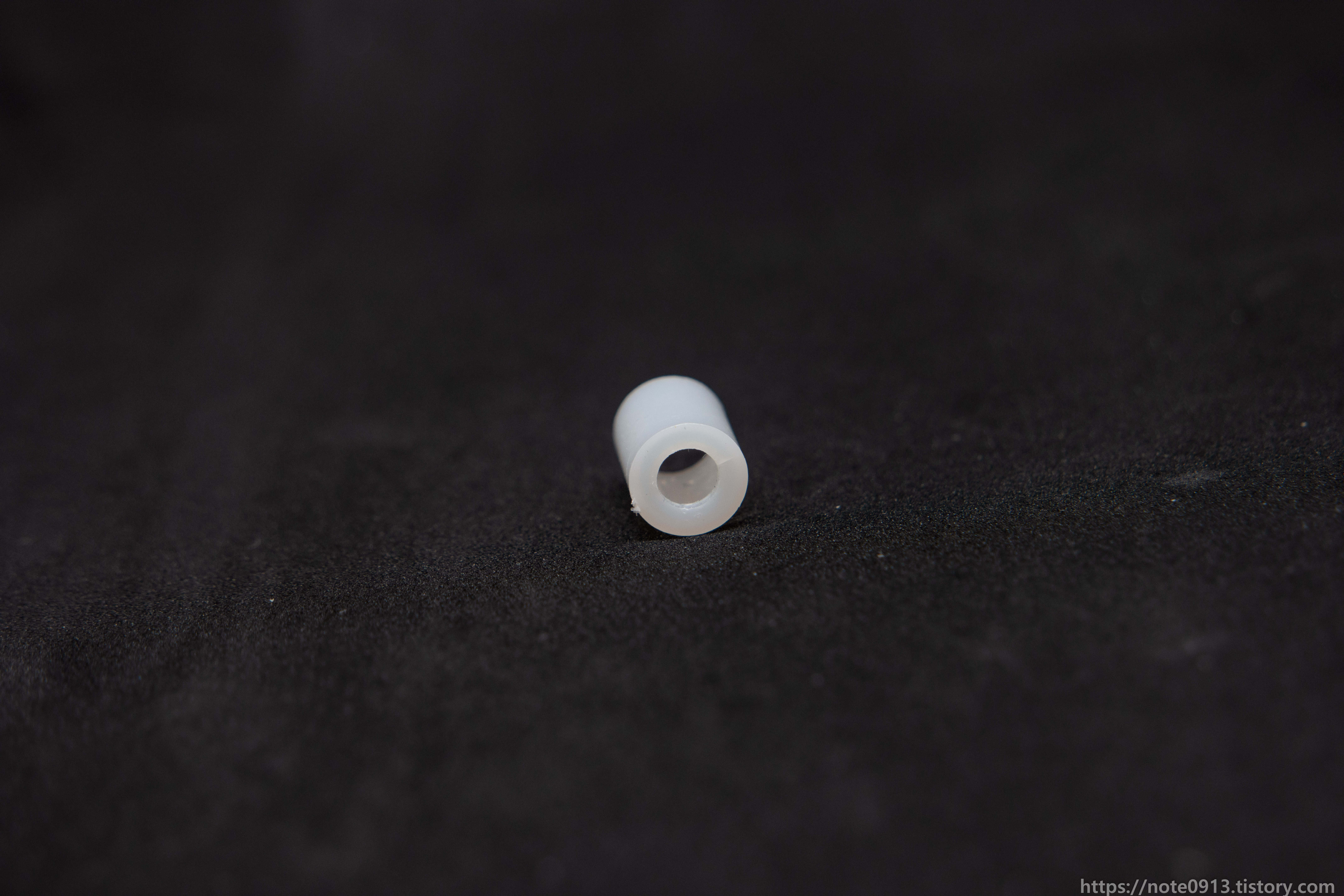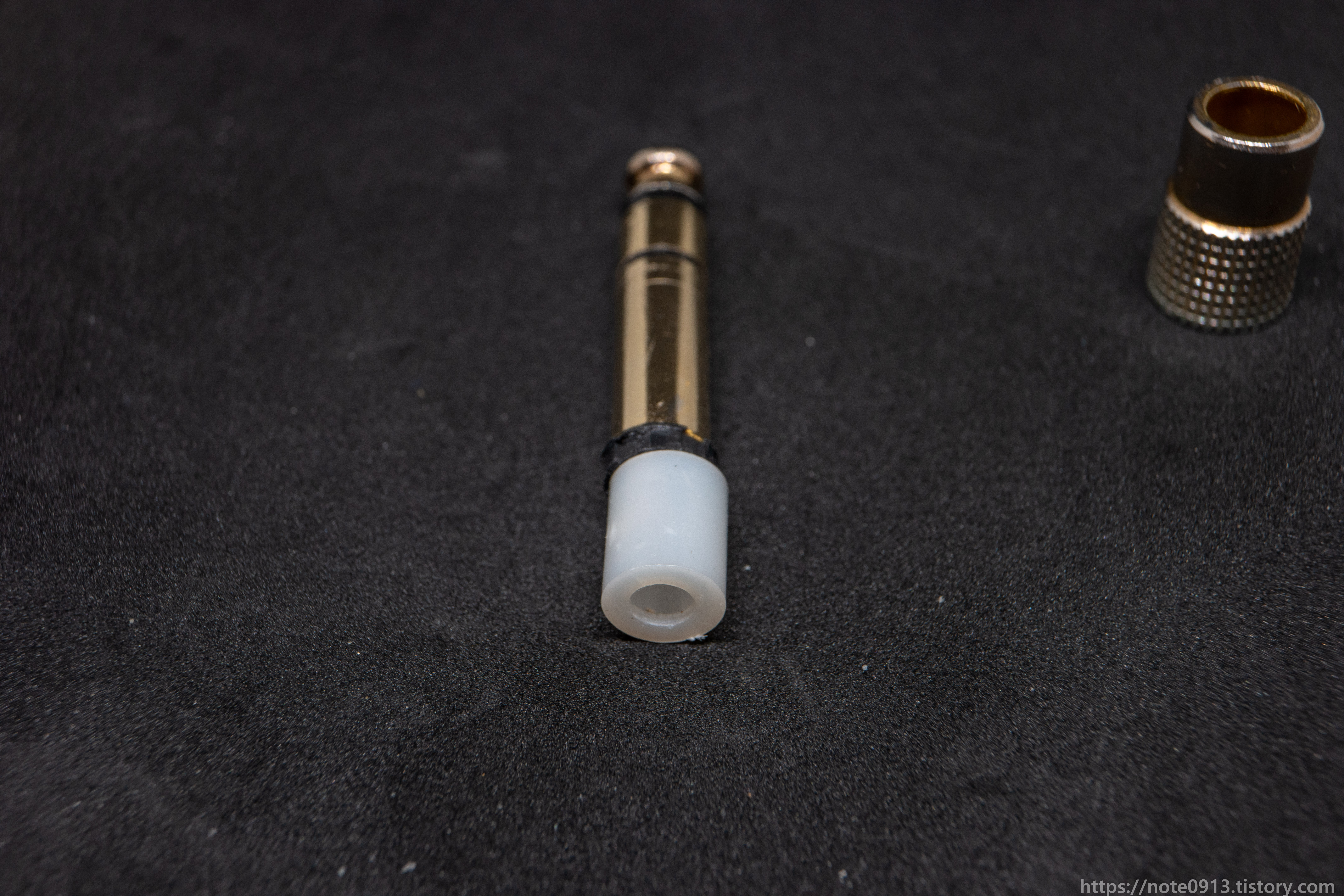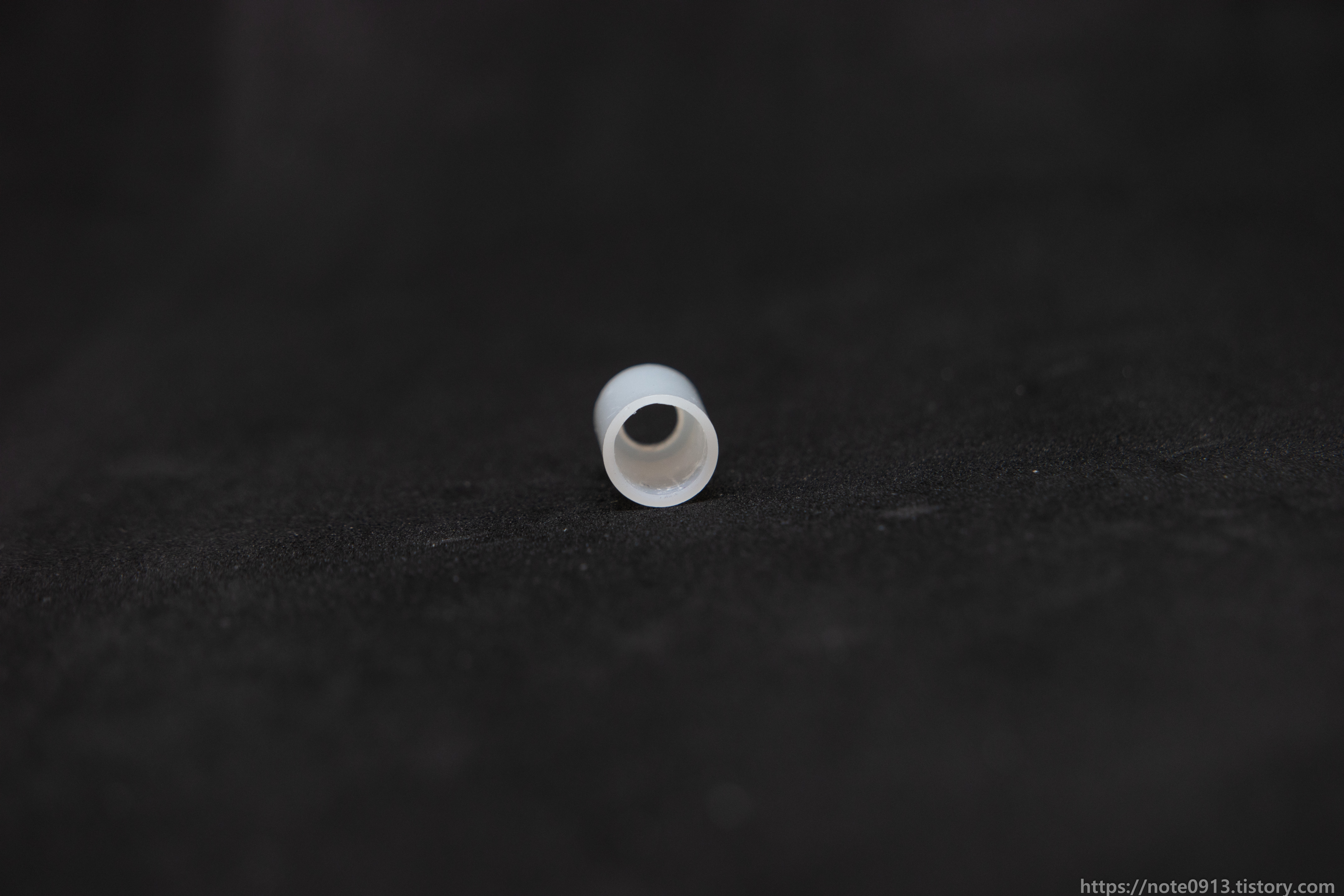 플라스틱 원통입니다. 한쪽은 구멍이 작고 한쪽은 구멍이 큰 형태로 되어있습니다. 나중에 조립할 떄, 구멍이 작은 쪽이 위쪽, 3.5mm 넣는 곳으로 향해야 합니다. 구조를 보니 플라스틱 원통의 역할은 TRS 잭의 금속 핀이 벗어나지 않게 텐션을 유지하는 역할과 절연 역할, 그리고 조립했을 때 마개와 함께 분리되지 않도록 지지하는 역할을 하는 듯 합니다.