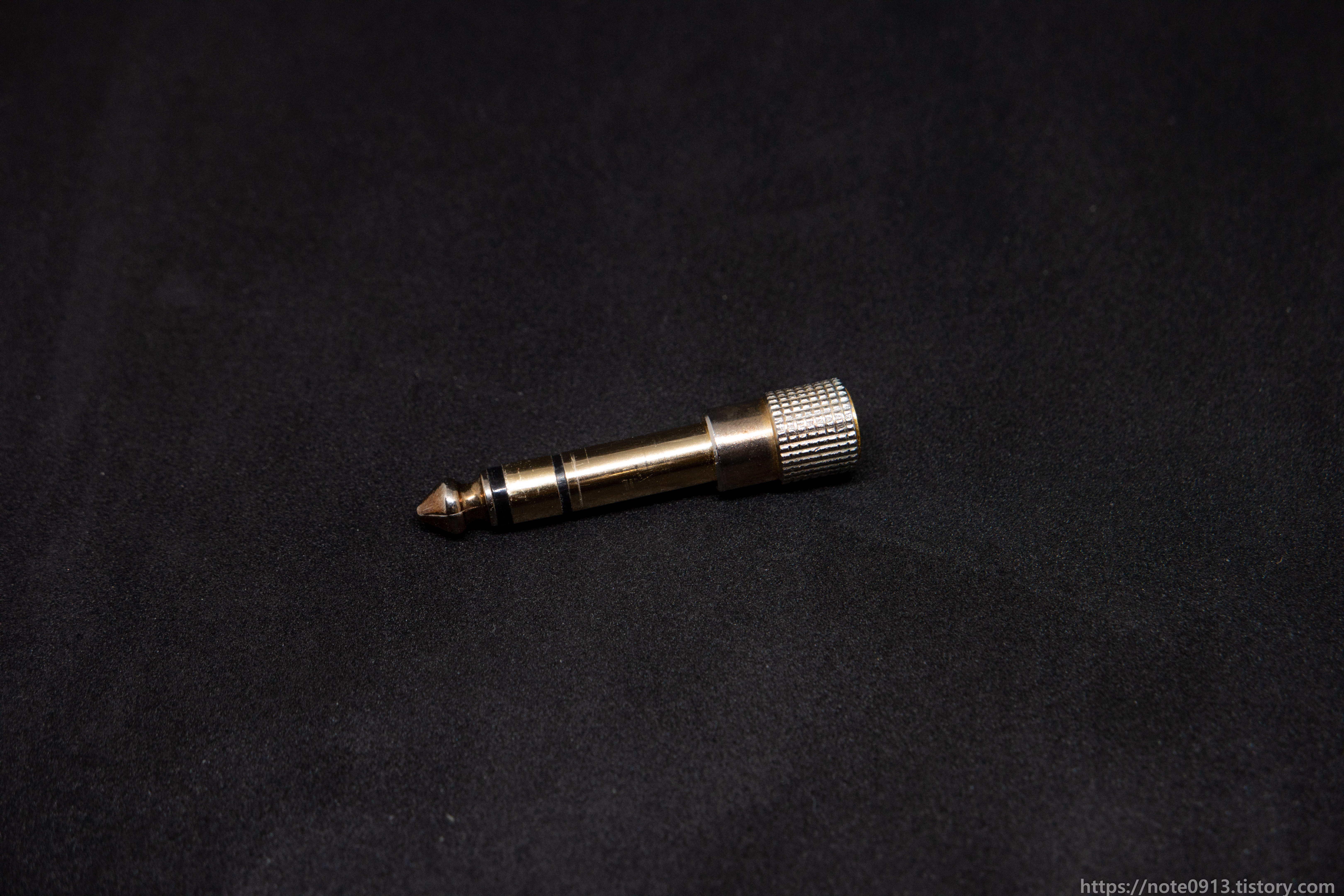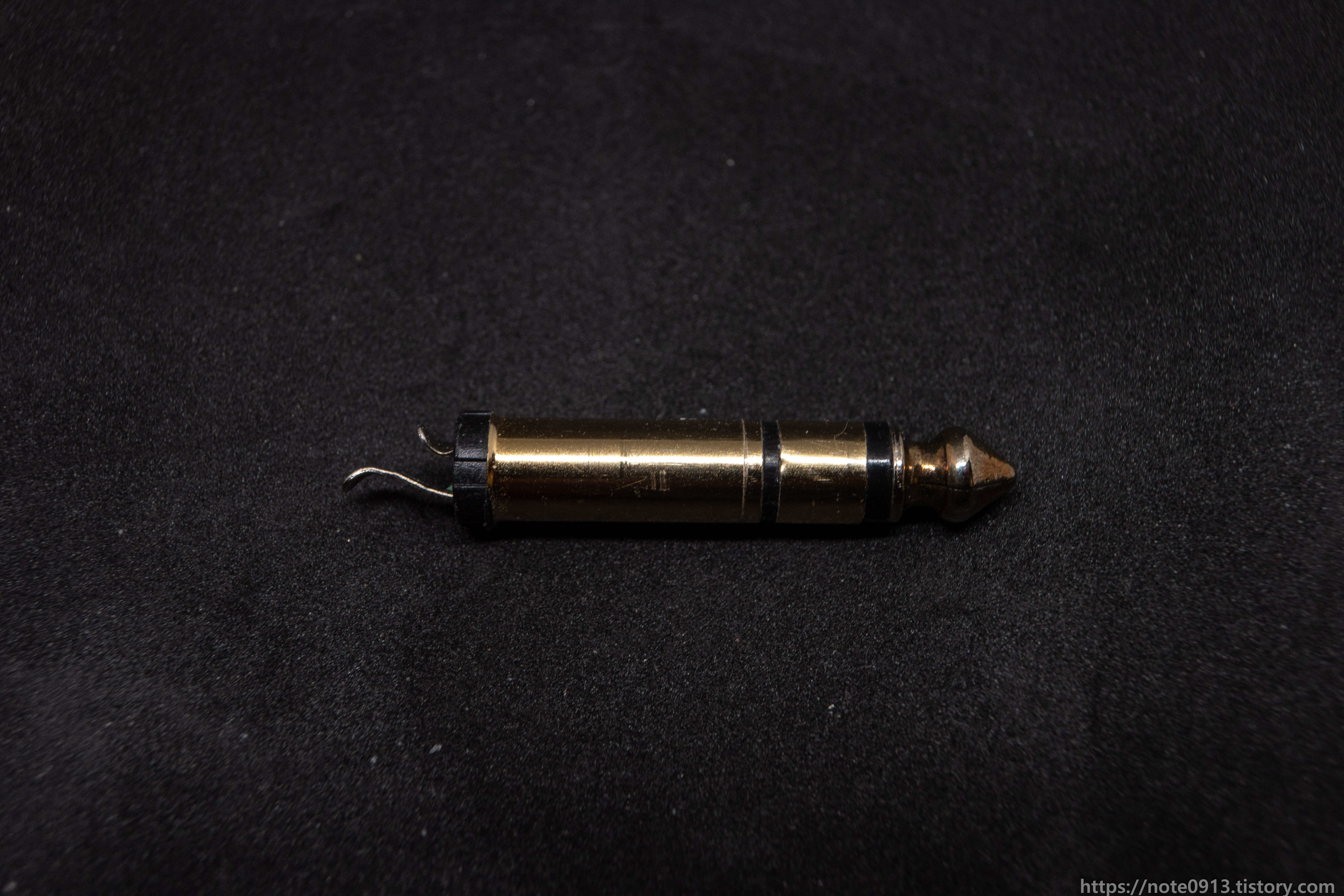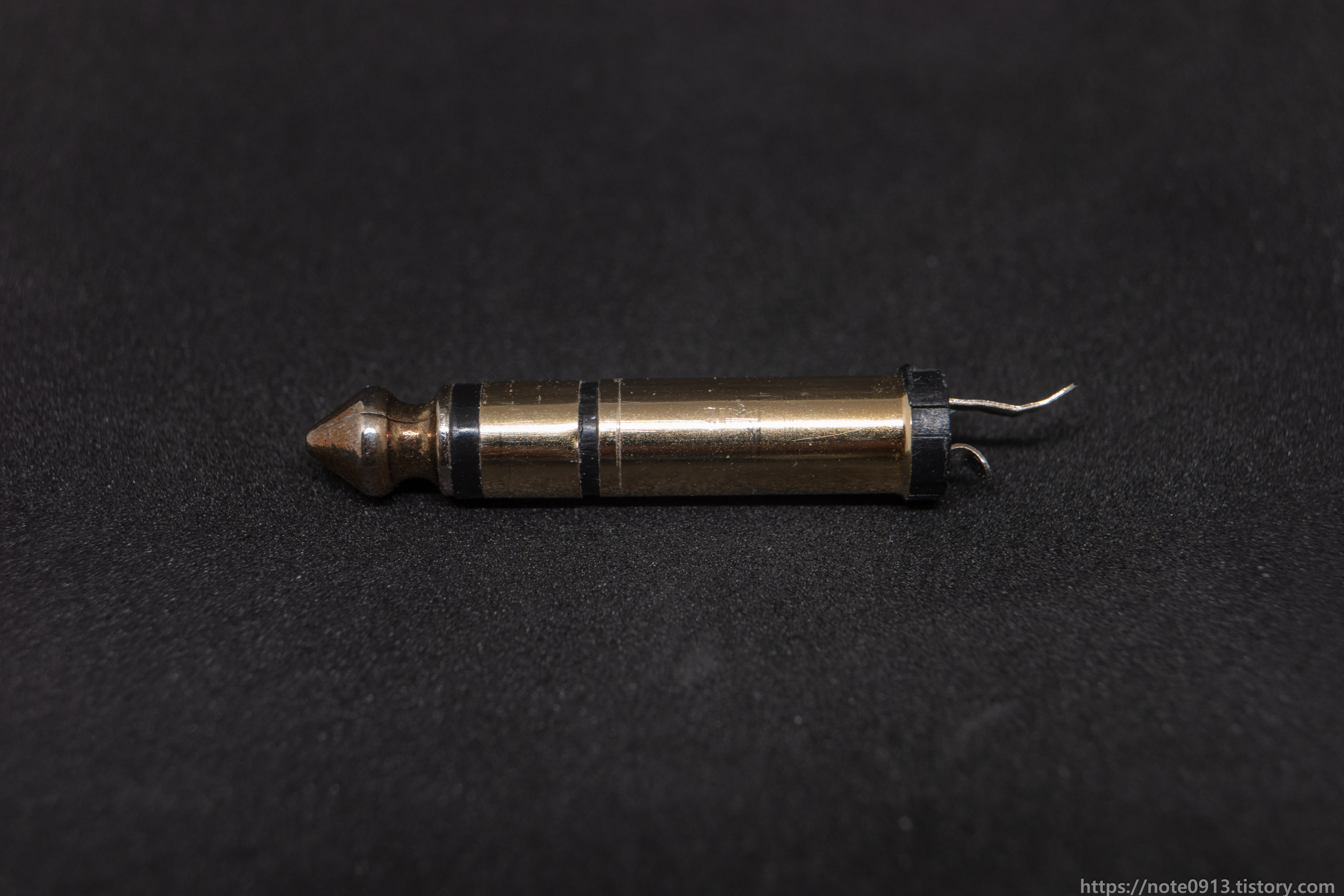 일명 총알잭이라고 불리는 어댑터입니다. 3.5mm 오디오 단자를 6.35mm 단자로 변환해주는 어댑터입니다. 인치로는 1/8"(3.5mm)를 1/4"(6.35mm)가 바꿔주게 됩니다.