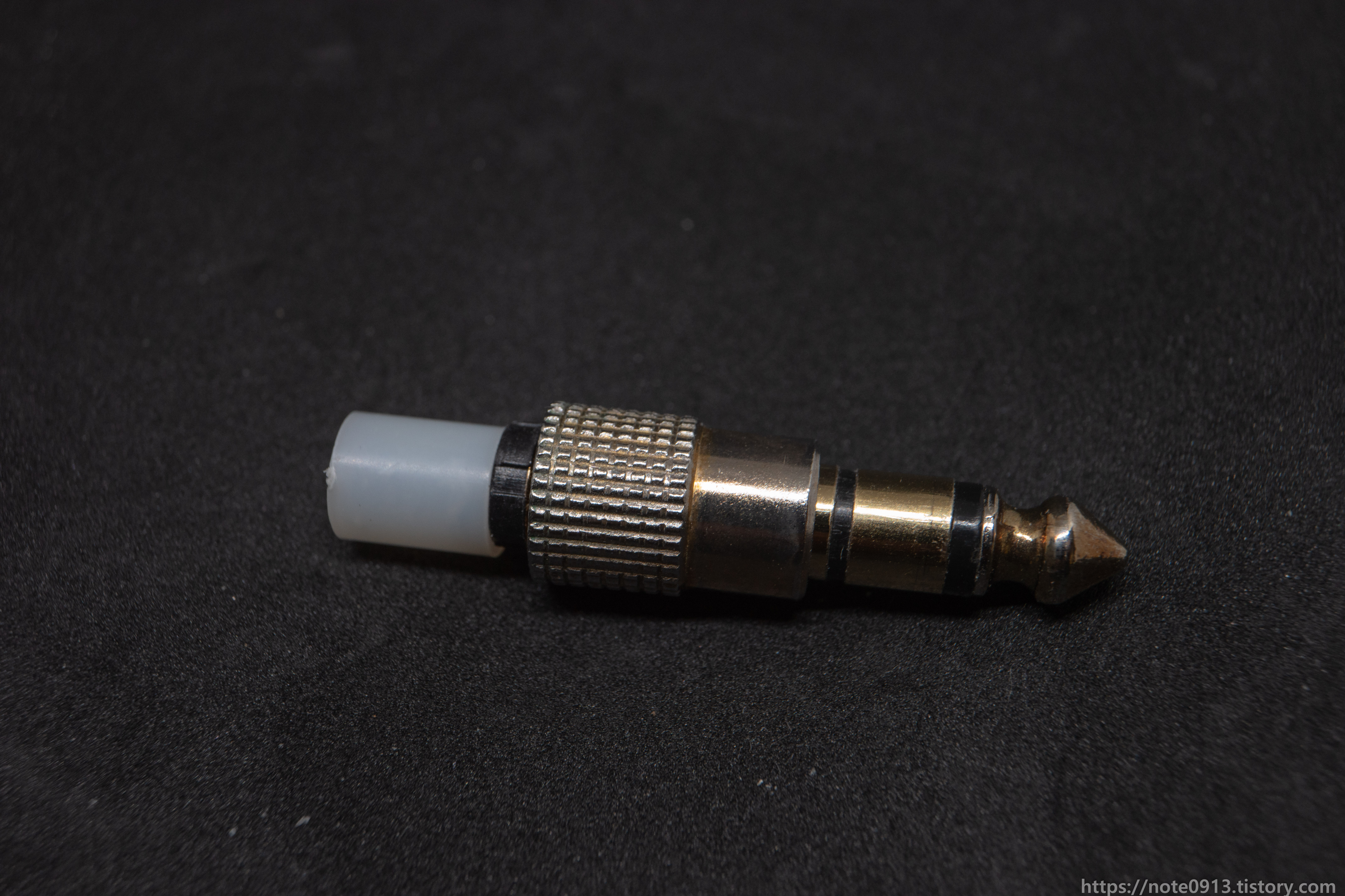 분해를 해보면 4가지 파츠로 구성되어 있습니다. 왼쪽부터 TRS 잭 부분, 플라스틱 원통, 손잡이 부분, 마개 순으로 구성되어 있습니다.