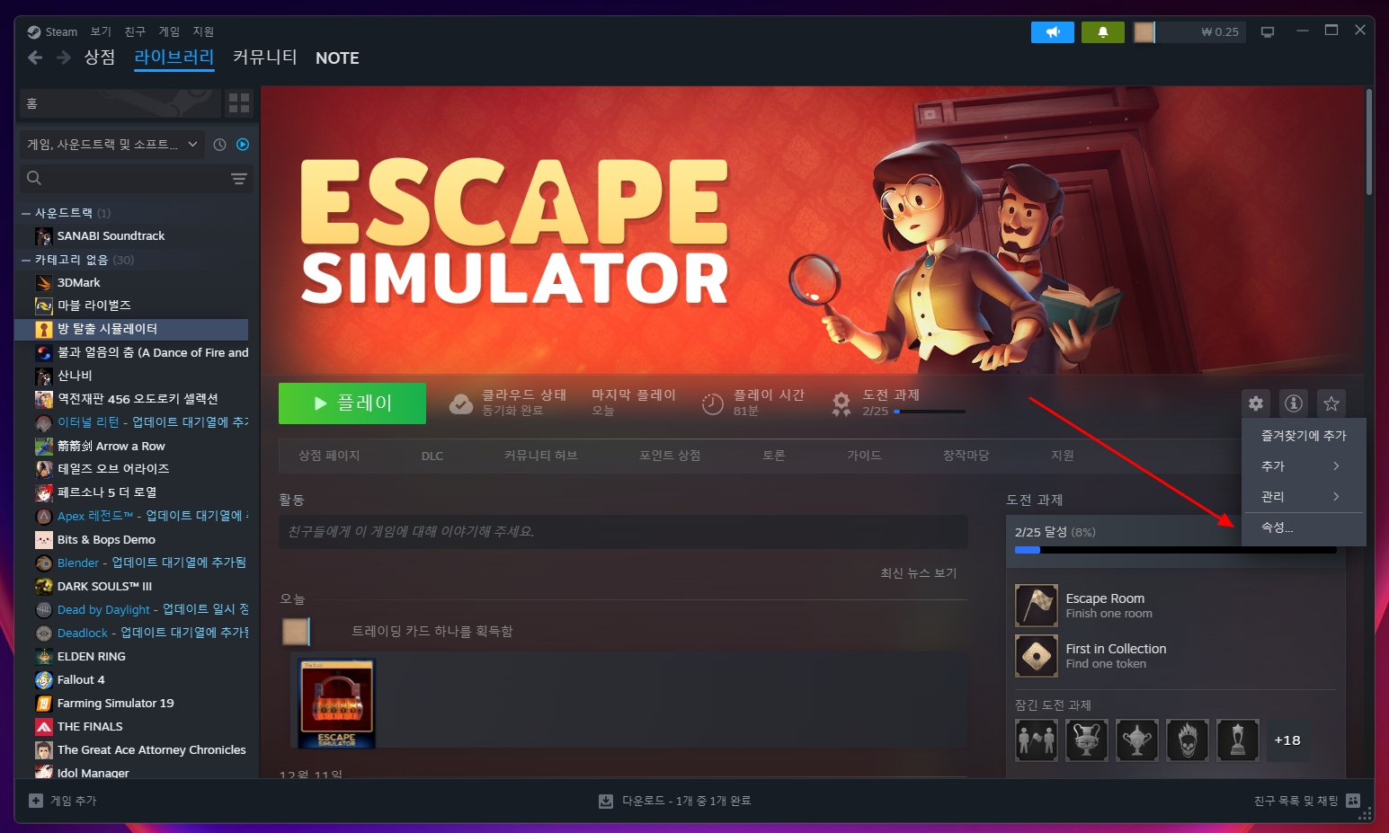 다른 방법으로는 게임 목록에서 원하는 게임 우클릭하면 위 사진처럼 똑같은 메뉴가 나옵니다.