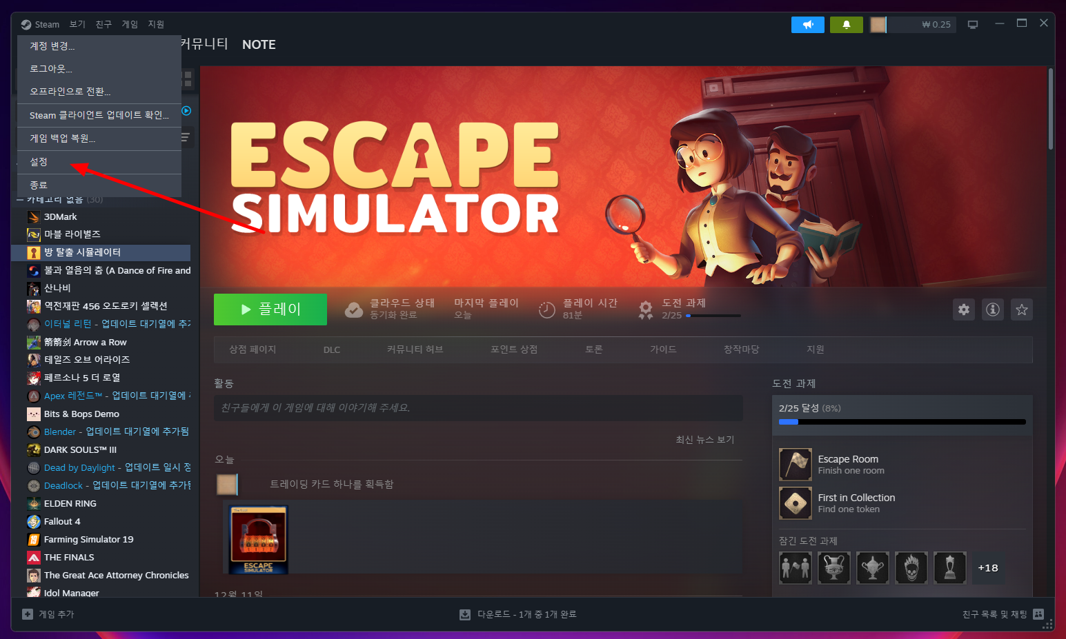 스팀 설정에 들어가기 위해 스팀에서 좌측 상단에 있는 Steam 메뉴를 클릭하고 설정을 클릭해 줍니다.