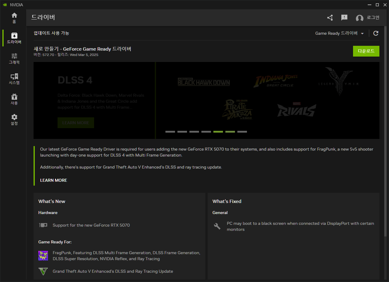 이 때는 결국 모니터 문제라고 판단하고 DP케이블 대신 HDMI 케이블로 연결해 임시방편으로 사용하고 있었는데 오늘 엔비디아 그래픽 드라이버 업데이트가 나왔습니다.
