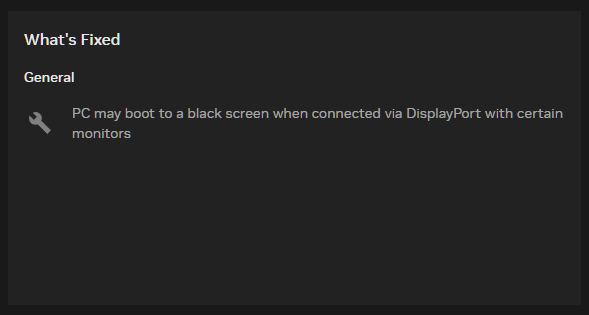 번역하면 부팅시 특정 모니터를 디스플레이 포트로 연결시 검은화면만 나온다는건데 이번에 나온 572.70 버전에서 이 문제를 수정했다고 하네요.