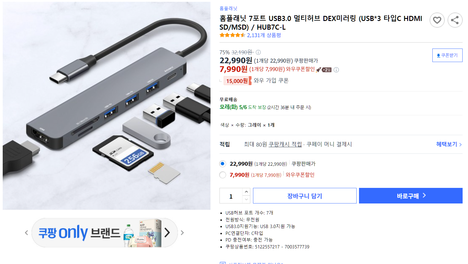 현재 별점 4.7점, 리뷰 2131개를 가진 홈플래닛 7포트 USB3.0 멀티허브 DEX미러링 (USB*3 타입C HDMI SD/MSD) / HUB7C-L! 지금 쿠팡에서 더 저렴하고 다양한 USB허브 제품들을 확인해보세요.