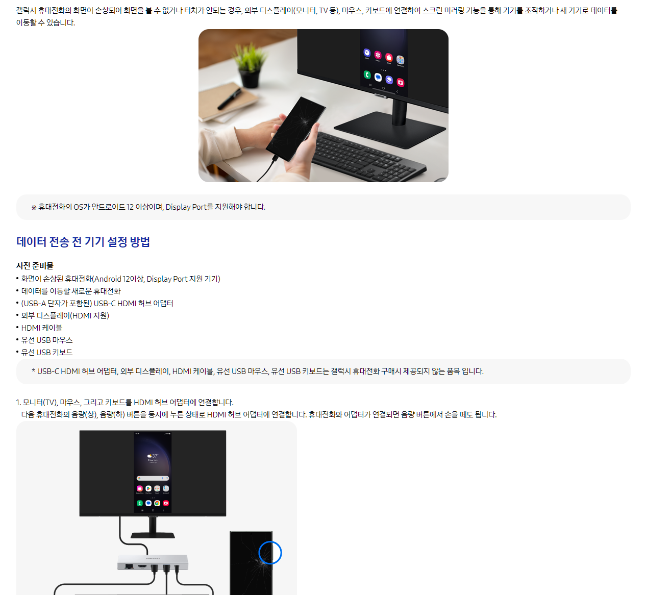삼성전자 서비스센터에서 직접 화면이 손상된 경우 미러링을 통해서 화면을 다른 모니터에 출력해서 데이터를 백업하는 방법을 설명해주고 있습니다.