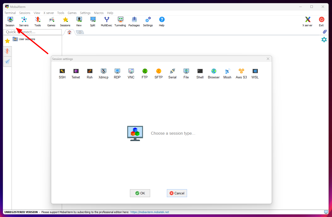 실행시키면 이런화면이 나옵니다. 좌측 상단에 Session(세션)을 클릭하면 다양한 프로토콜로 연결할 수 있습니다.