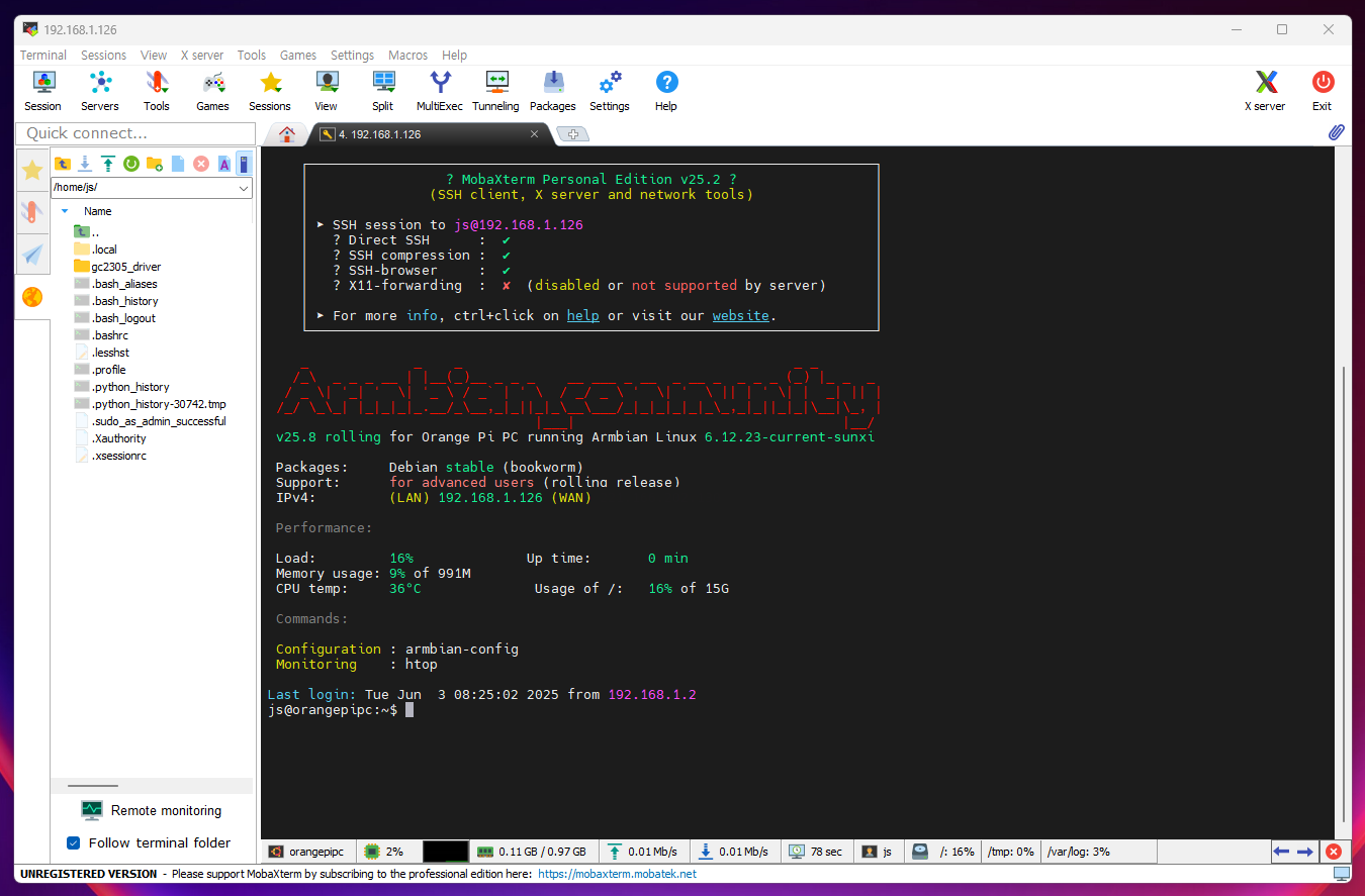 SSH로 접속하여 로그인하면 이런 터미널 화면이 나타납니다.