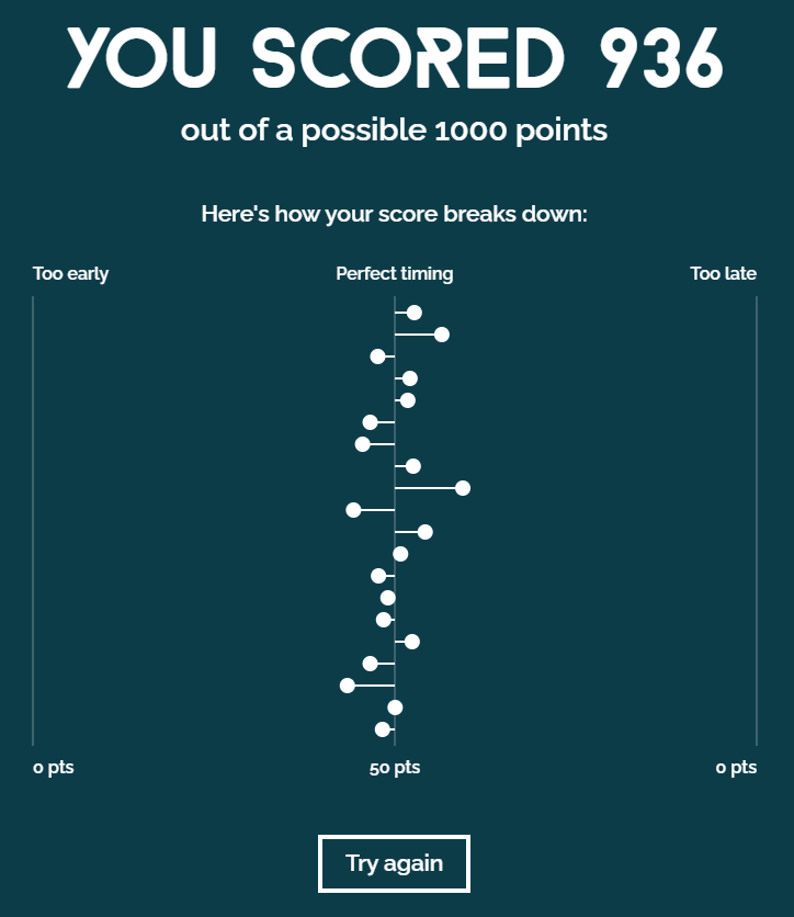 소리에 맞춰서 계속누르다보면 소리가 사라집니다. 소리가 사라져도 박자에 맞춰 눌러주면 됩니다. 그러면 점수가 1000점 만점으로 점수가 나옵니다. 저 같은 경우에는 936점이 나왔네요.