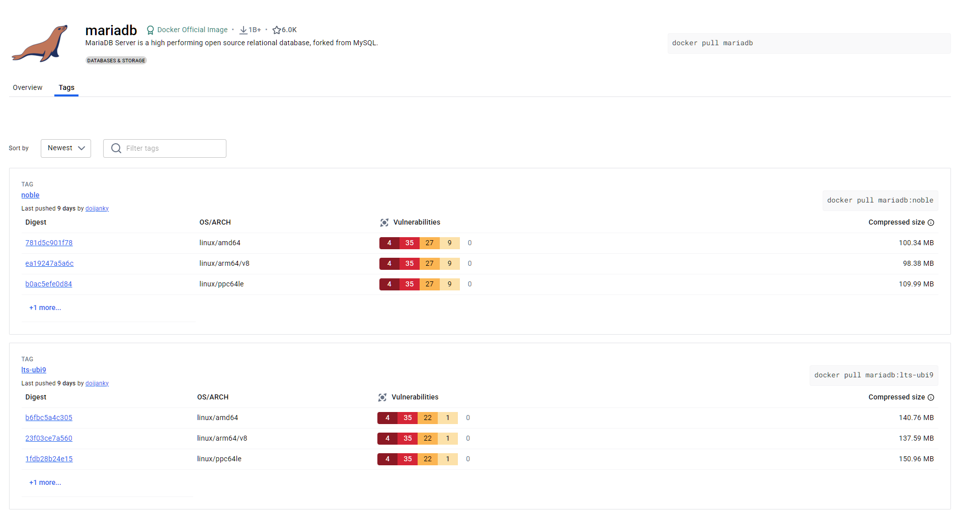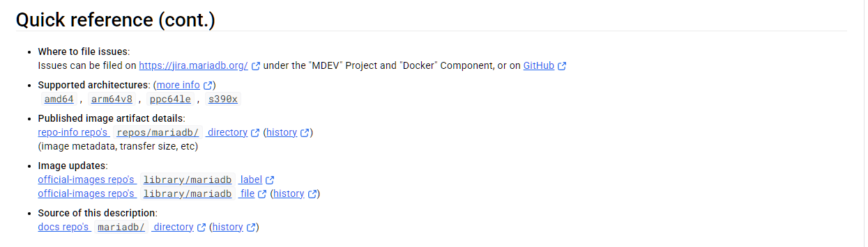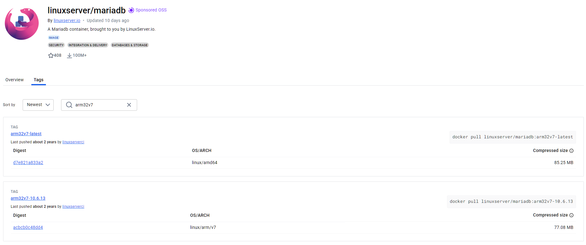 docker hub에 접속해서 mariadb를 찾아보니 빌드된 이미지에서 armv7(arm32v7) 아키텍쳐를 지원하지를 않네요.