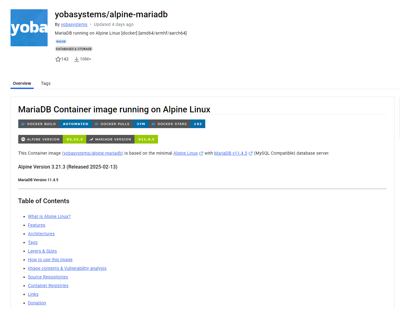 두번째는 yobasystems/alpine-mariadb 입니다. mariadb 버전은 현재 11.4.5까지 지원합니다.
