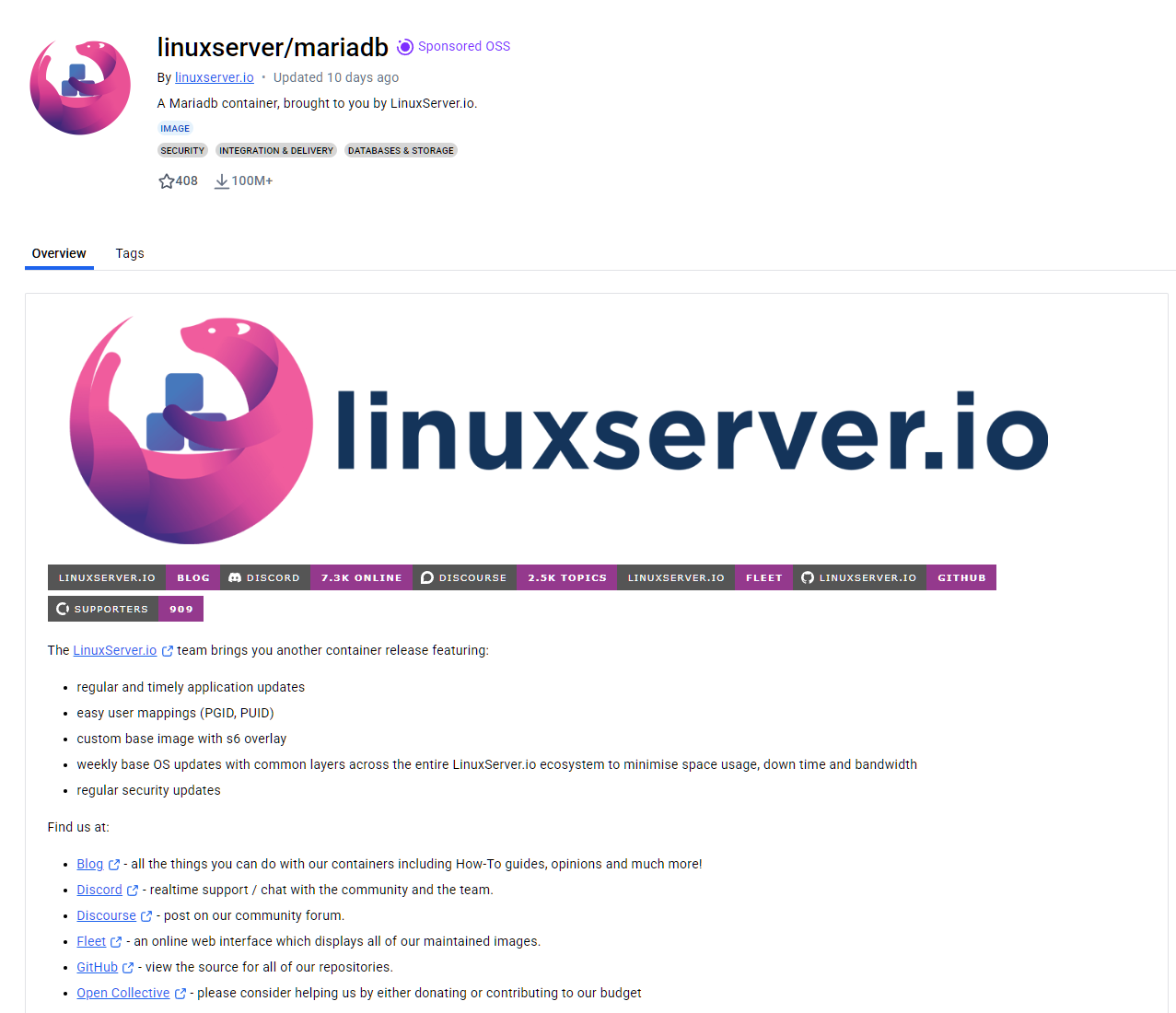 2개가 있는데 하나는 linuxserver/mariadb 이고 다른하는 yobasytesms/alpine-mariadb 입니다.